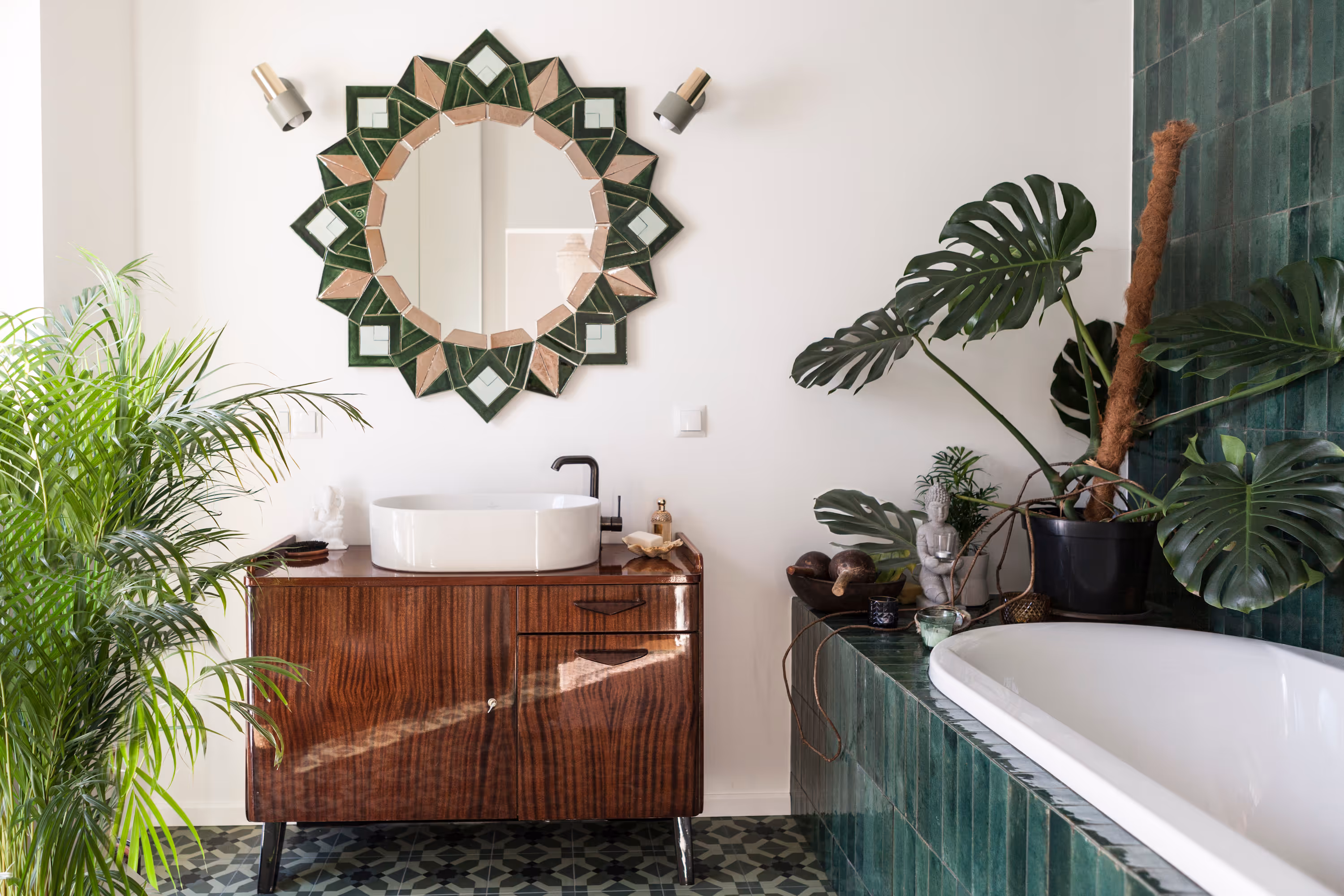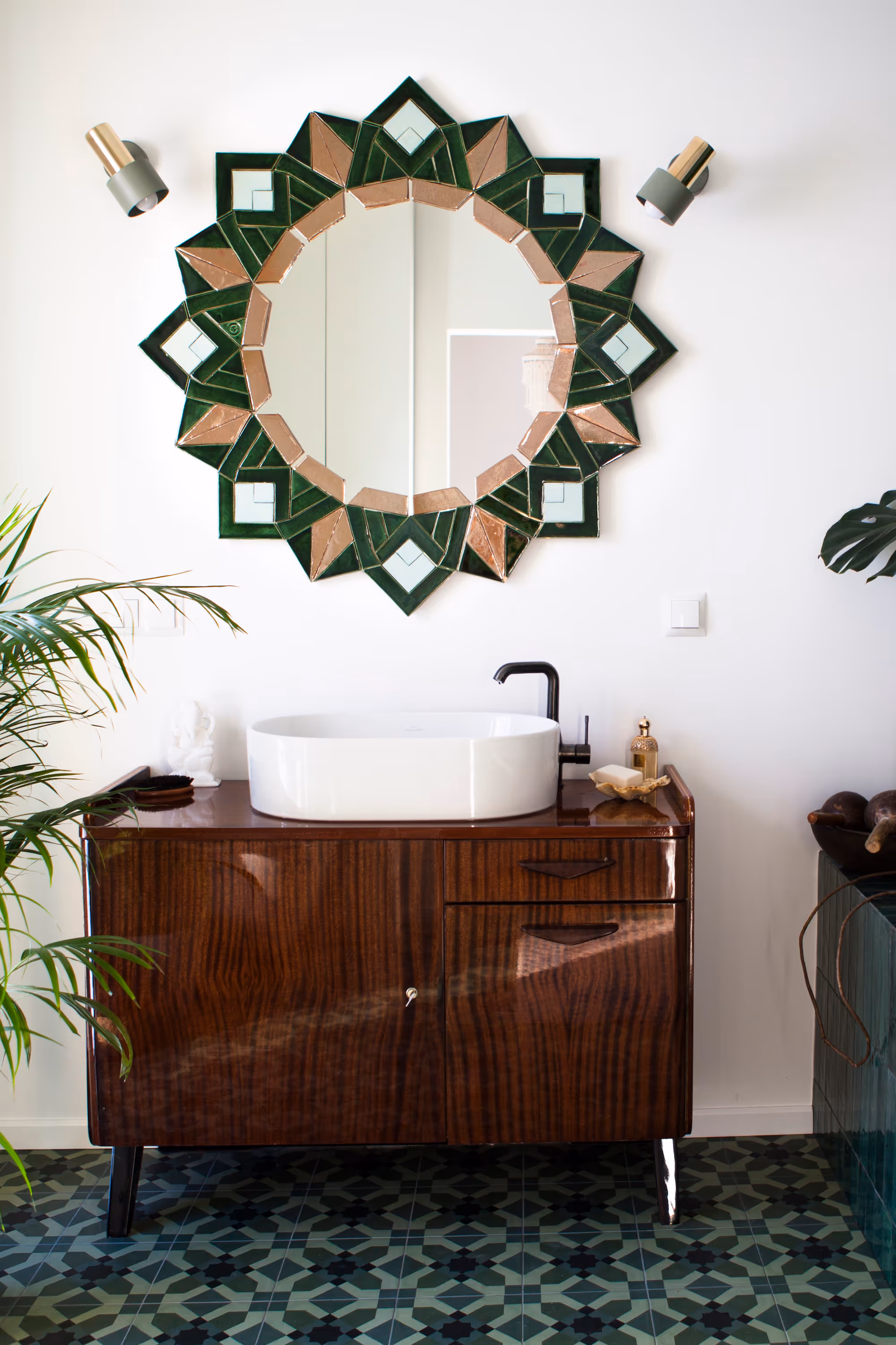 Lustro Bona w odcieniach butelkowej zieleni, mięty i złota to wyjątkowy akcent, który przywołuje atmosferę kojącego spaceru po lesie. Harmonijna symetria form oraz subtelne refleksy światła na złotych detalach wprowadzają do wnętrza aurę spokoju, elegancji i naturalnej harmonii.